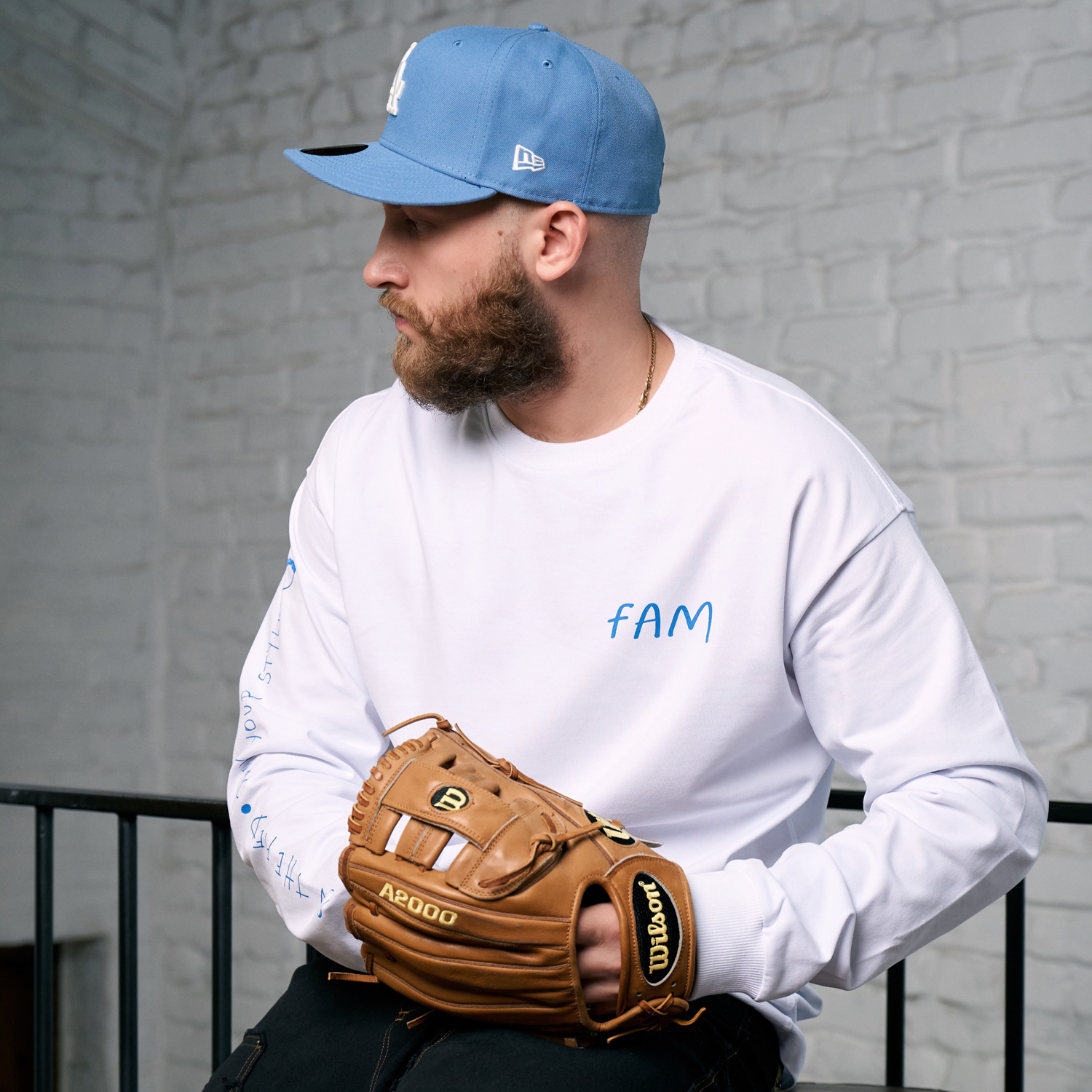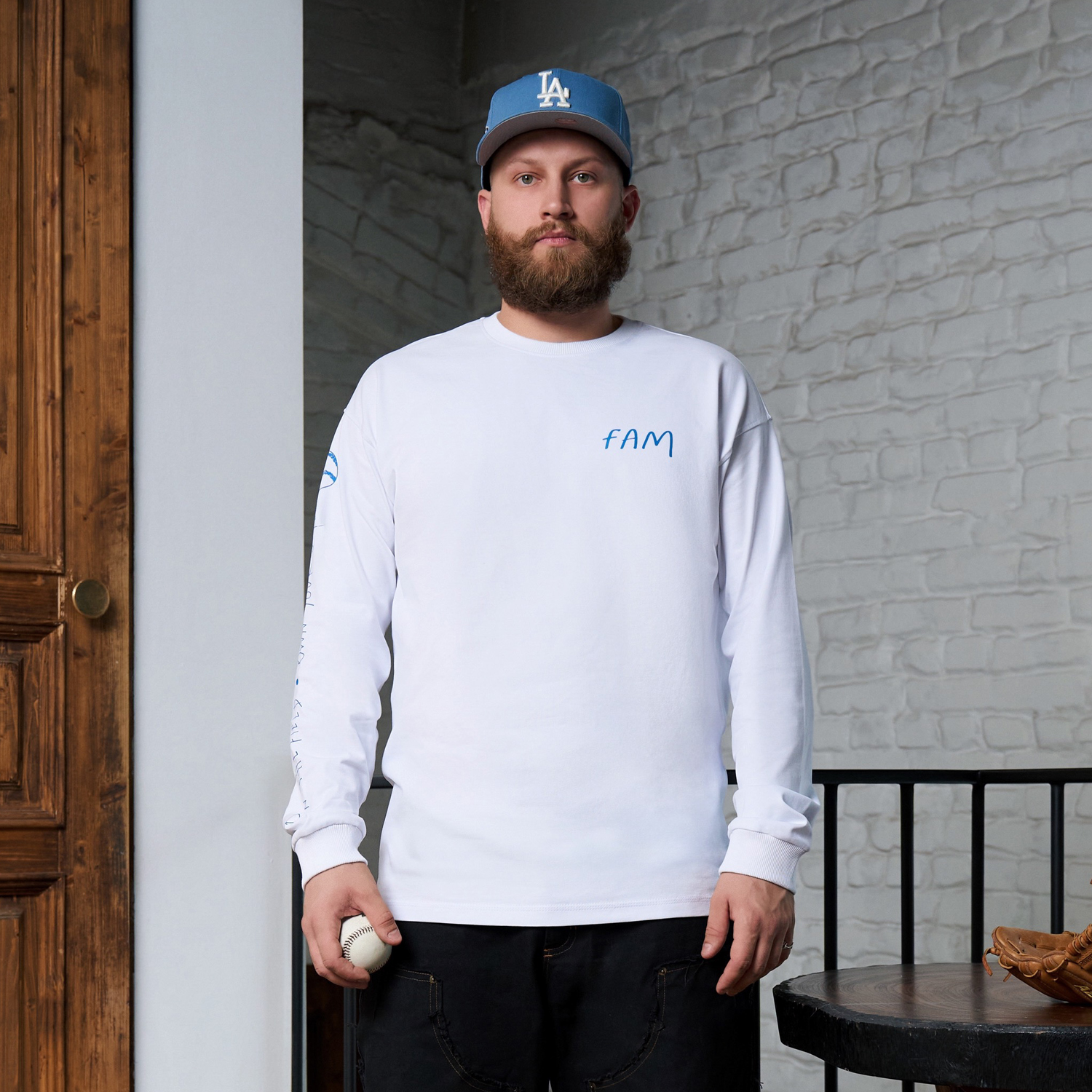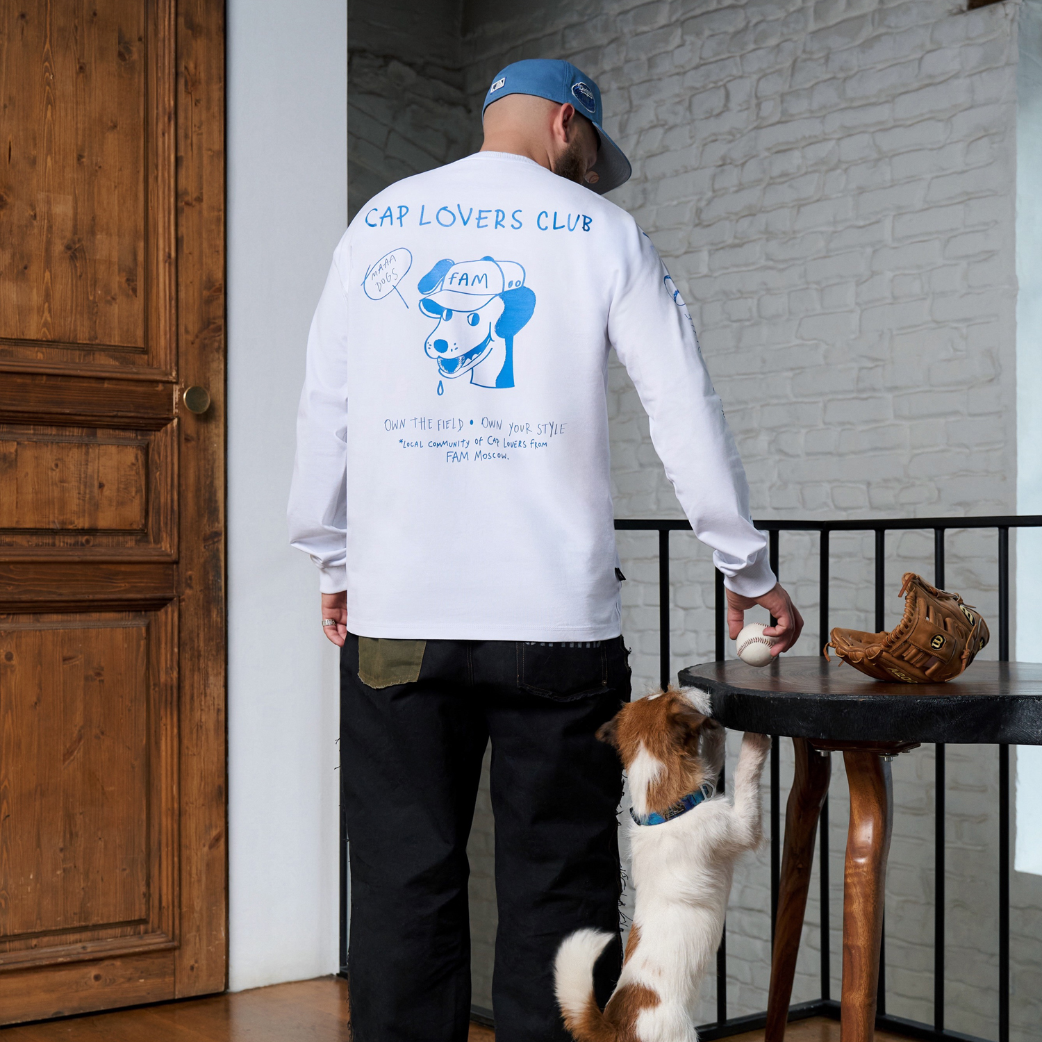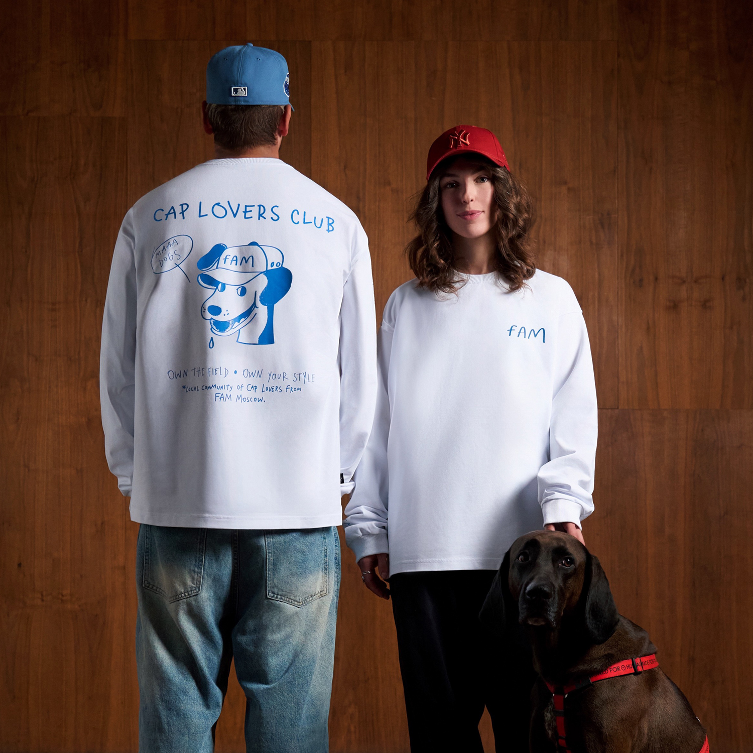 Лимитированный лонгслисв FAM «Maaa Dogs» белого цвета с синим принтом. Лонгслив разработан командой FAM для настоящих любителей кепок.